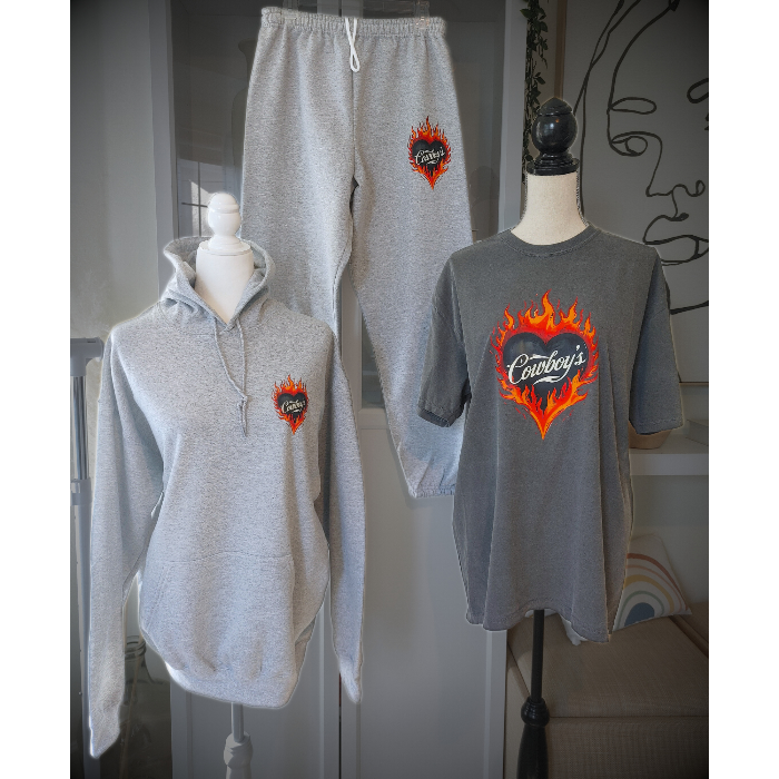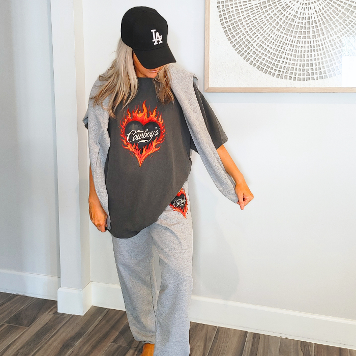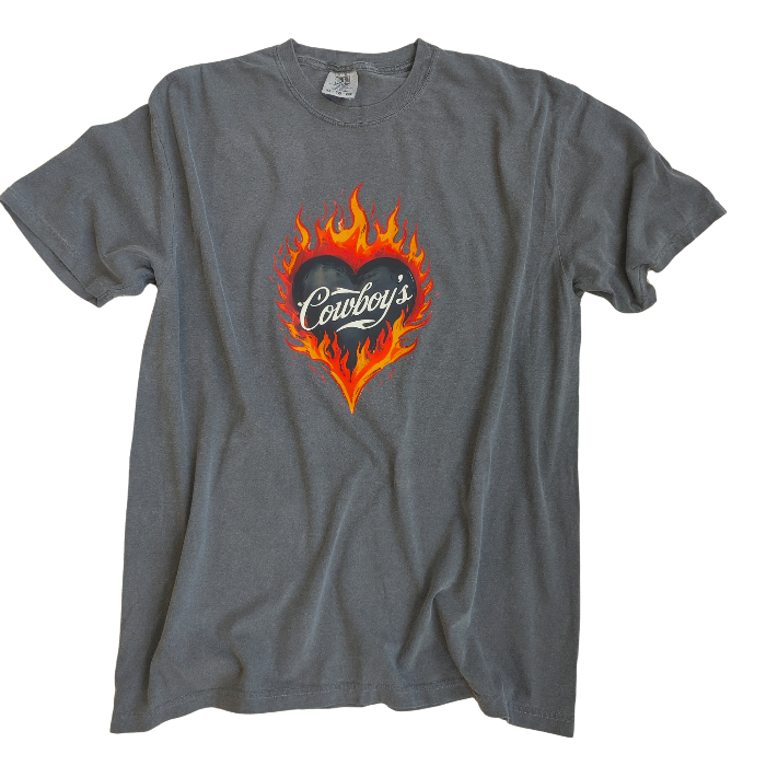 Turn up the heat with this Cowboys flame graphic t-shirt, designed for effortless western style with a modern, trendy edge. This vintage-inspired tee features a bold flaming heart βCowboysβ graphic on a rich pepper-colored base, giving it that worn-in, lived-in look everyone loves.