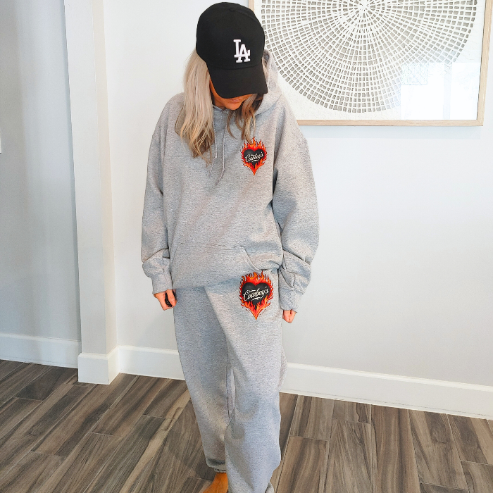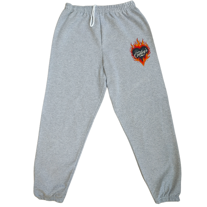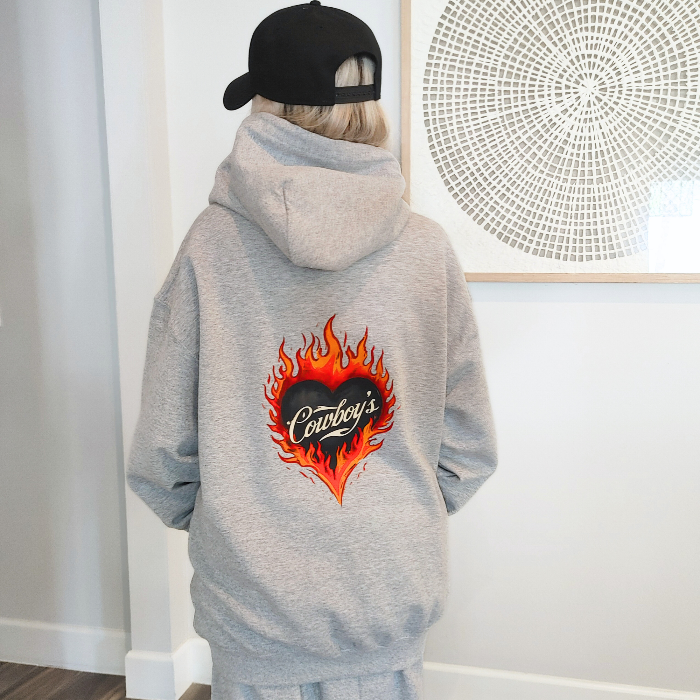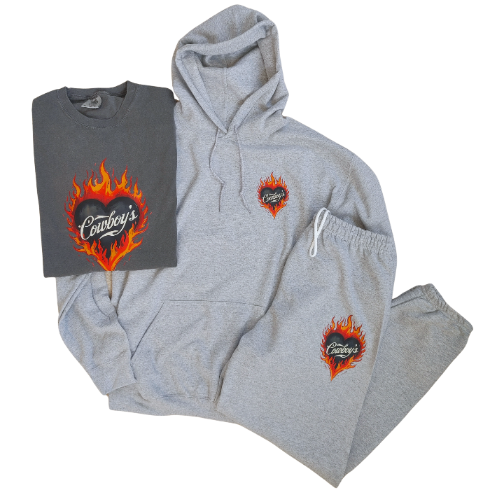 This matching Cowboys flame sweatshirt and sweatpants set delivers bold western style with all-day comfort. Featuring a fiery heart βCowboysβ graphic, this gray lounge set is perfect for cozy days, casual outings, travel, or effortless cowgirl street style.