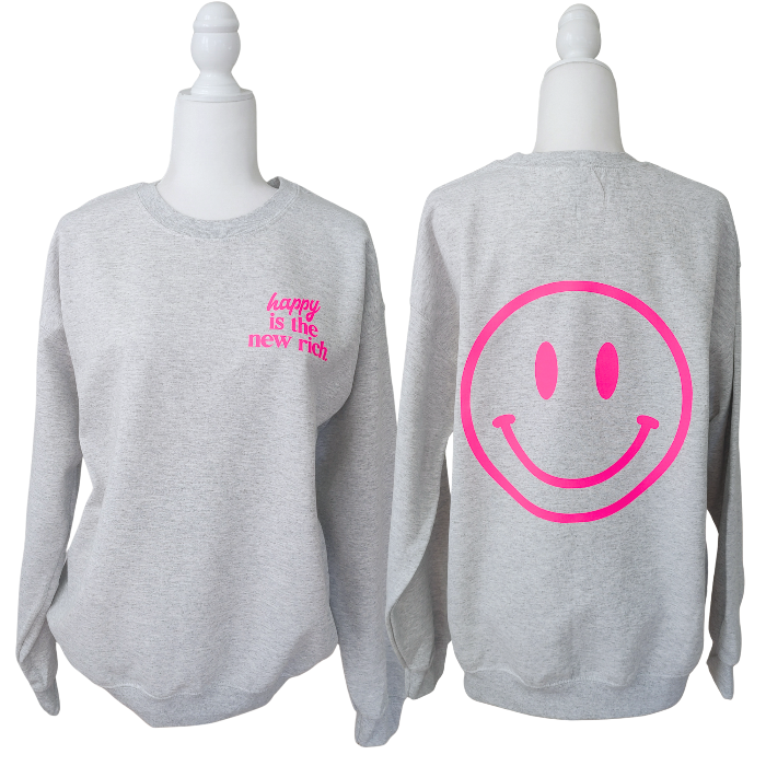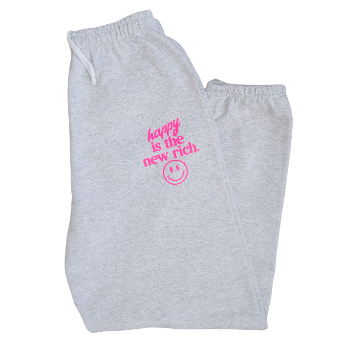Bring all the happy vibes with this trendy “Happy Is the New Rich” loungewear set. Designed with a bold neon-pink graphic and a preppy, on-trend style, this matching sweatshirt and sweatpants outfit is the perfect blend of cozy comfort and feel-good energy. The sweatshirt is soft, relaxed, and features the neon-pink “Happy Is the New Rich” design on the front with a large smiley face graphic on the back. If you want that oversized, stylish, slouchy look, we recommend sizing up for the perfect relaxed fit. The matching sweatpants complete the vibe with the same neon-pink design, bringing the whole look together. With an elastic waistband, elastic cuffs, and an oversized cozy fit, these joggers are ideal for lounging, errands, travel days, and everyday comfort. This coordinated set is great for gifting, weekend wear, travel outfits, or anyone who loves a cute and comfy preppy style. It’s the kind of outfit that instantly boosts your mood—because happy really is the new rich.