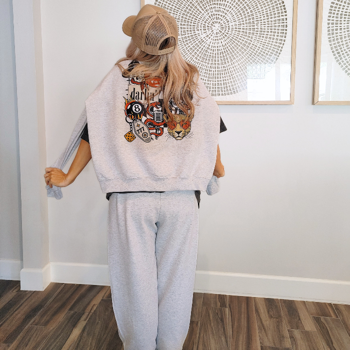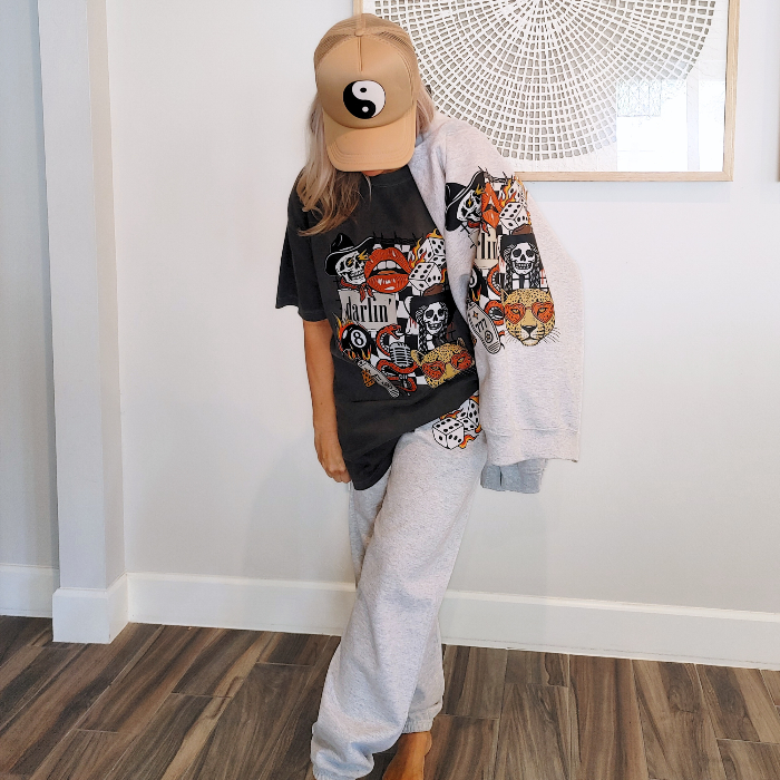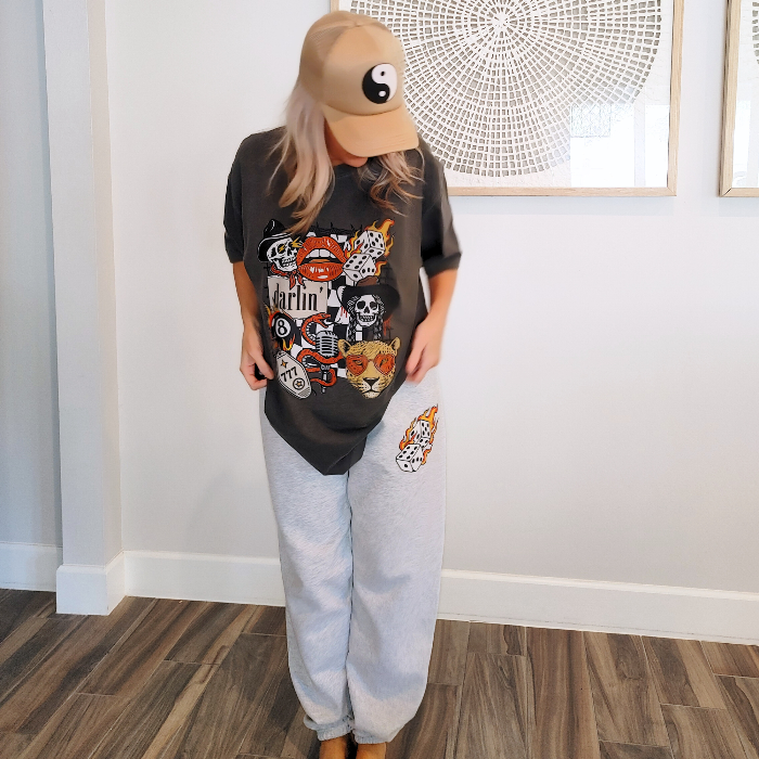 Bring bold retro energy to your wardrobe with this 3-piece vintage Western tattoo graphic set, including a cozy sweatshirt, Comfort Colors tee, and matching flame-dice sweatpants. This unique outfit blends Western motifs, retro illustrations, and effortless comfort—perfect for everyday wear, gifting, or standout loungewear. This Western graphic set mixes comfort with standout style—ideal for festival outfits, casual streetwear, cozy days in, or gifting to anyone who loves bold retro designs.