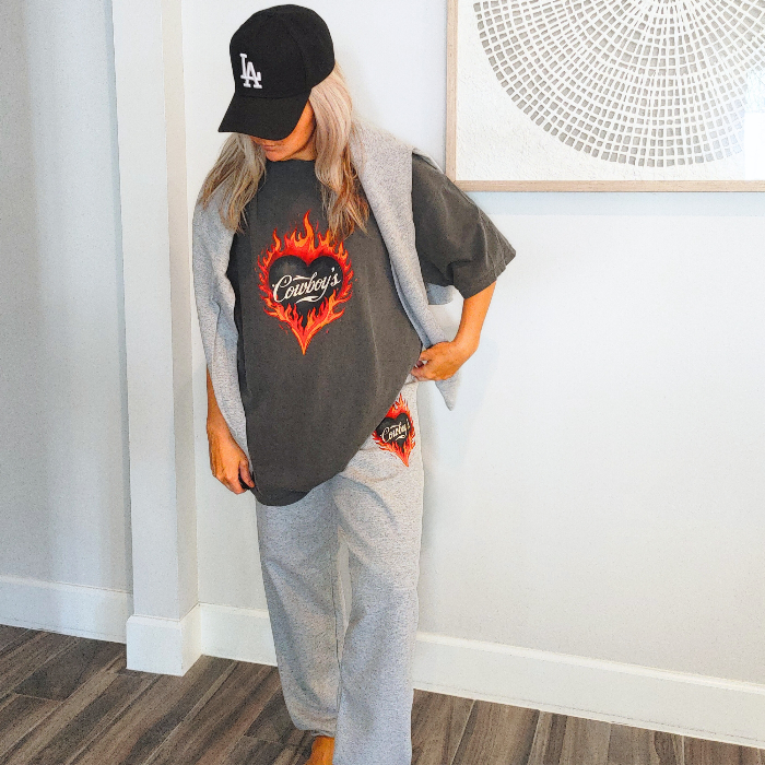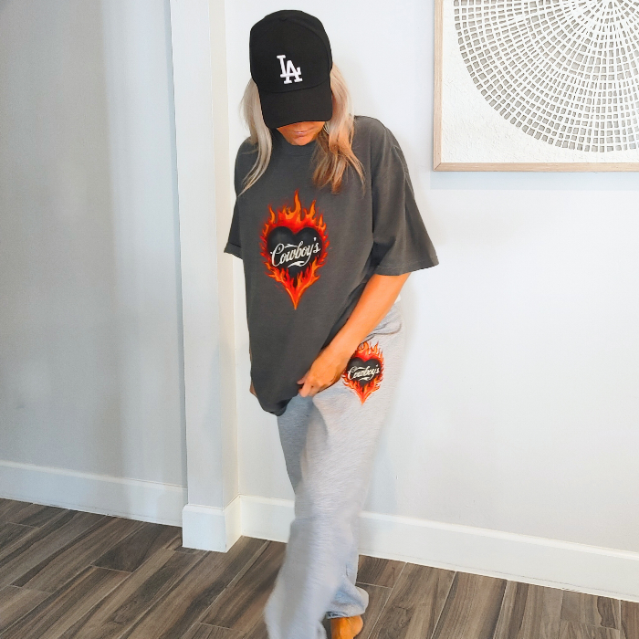 Bring bold western energy to your everyday wardrobe with these Cowboys flame sweatpants. Featuring a striking flaming heart βCowboysβ graphic, these gray jogger-style sweatpants are designed for laid-back comfort with a statement edgeβperfect for lounging, running errands, or styling with your favorite western-inspired pieces.