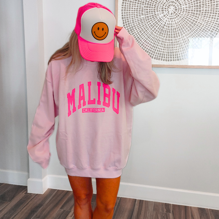 Our super soft pink Malibu crewneck is a great stylish and trendy piece. The Malibu California sweatshirt is perfect for layering or wearing alone for a casual look. With neon pink lettering, this sweatshirt is preppy in style and also makes the perfect gift! Don't forget to size up for an oversized trendy look.